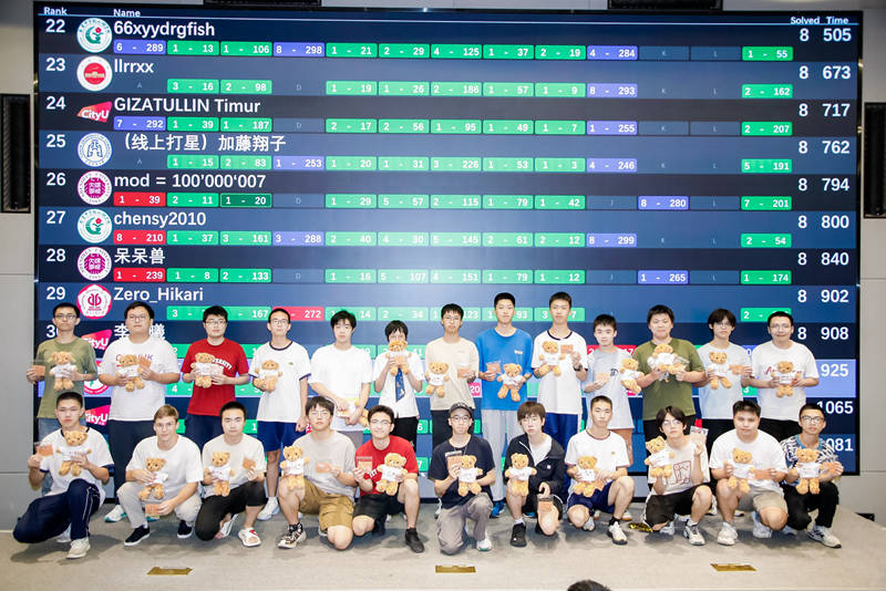 热身赛之后,比赛正式开始,选手按照通过题目数量为第一关键字,罚时降序作为第二关键字进行最终排名。比赛结束后,各选手在图书馆报告厅进行滚榜、颁奖及题目讲评环节。现场通过逐一公布封榜期间的选手递交结果,动态更新排名,最终确定获奖名单。