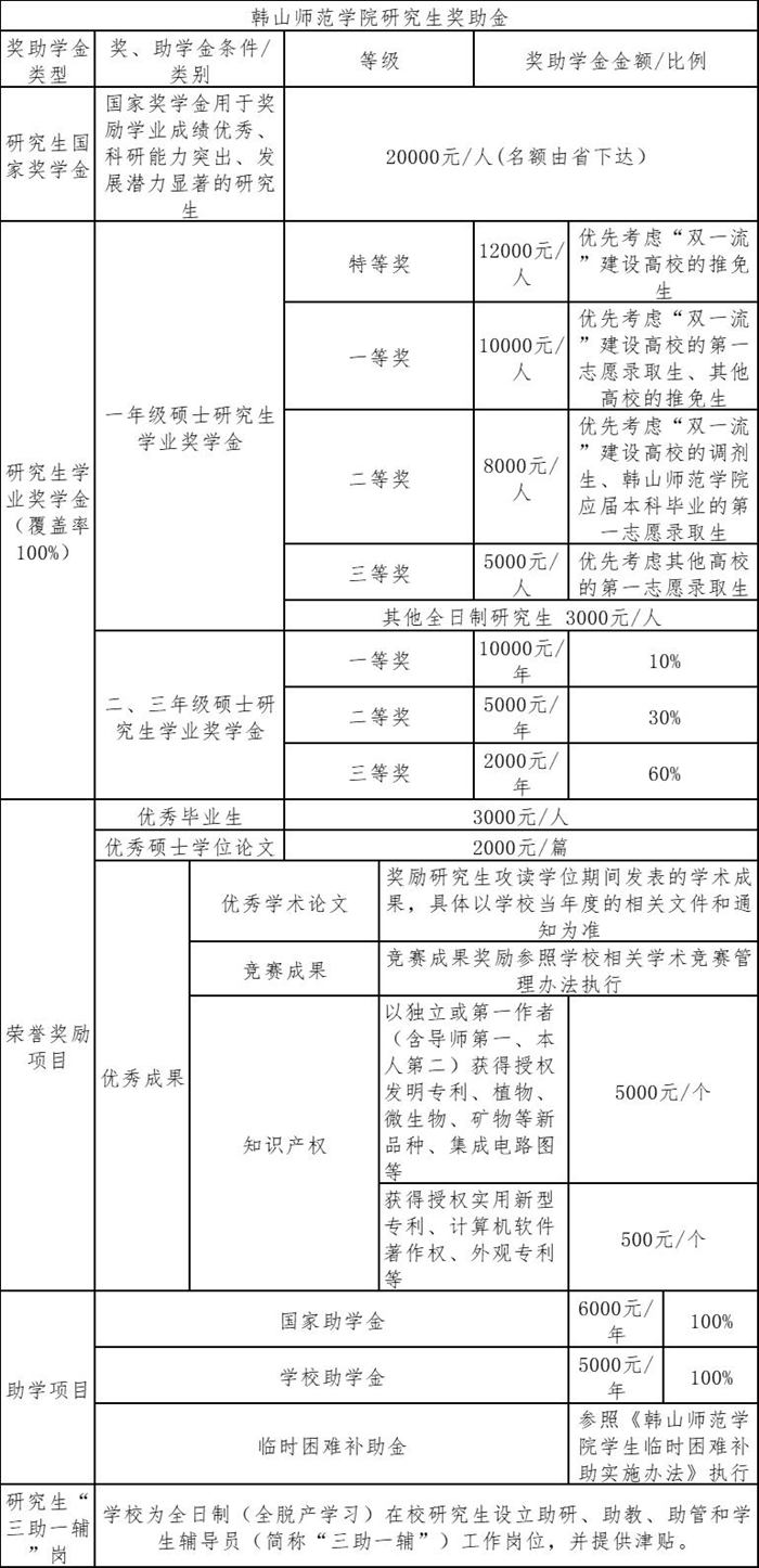 学校主要奖助学金政策如上表所示。表中各类奖、助学金仅面向全日制硕士研究生,以上各条款如有变动,以国家、省和学校最新规定为准。