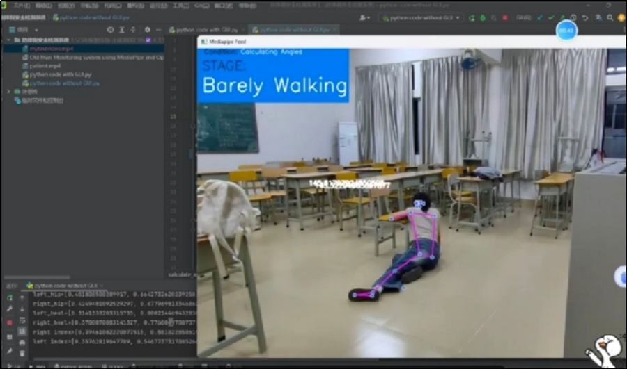 由极智佳创团队研发的“基于OpenCV和MediaPipe的防摔倒安全检测预警系统”,是一款集实时监测、智能分析与自动报警功能于一体的智能化系统。可解决类似侏儒症患者与中小学生处于同一场景时,因二者骨骼成熟度存在差异,可能导致意外发生情况的精准识别检测偏差问题。该系统创新性地运用计算机视觉与深度学习技术,通过团队自主研发的算法模型,能够精准计算关键点间的角度关系;实现了对人体数十个关键骨骼点的精准定位与持续追踪,有效识别跌倒过程中的特征姿态变化,从而在危险发生初期及时触发警报机制。
