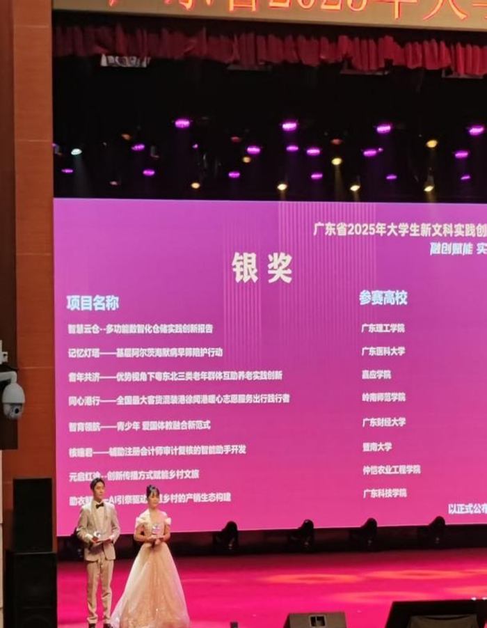 近日,广东省 2025 年大学生新文科实践创新大赛省级结果揭晓,广东理工学院 “极智佳创” 团队的 “智慧云仓 - 多功能数智化仓储实践创新报告” 项目,凭借创新技术方案、扎实产业成果与新文科跨学科特色,斩获省级银奖,为学校新文科实践创新领域再添荣誉!