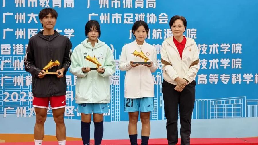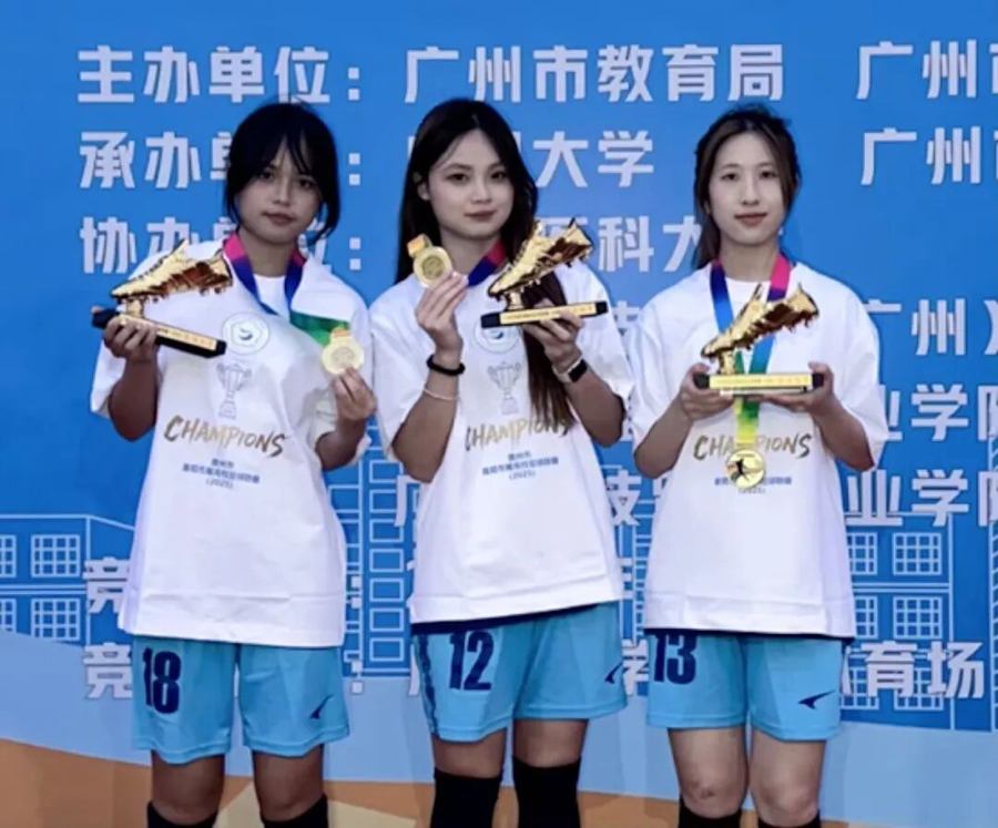 本届赛事自10月14日开赛,历时8天,赛事设有男子甲组、乙组和女子甲组、乙组四个组别,共有9所高校的14支代表队参赛。广州幼儿师范高等专科学校女子足球队不仅斩获女子甲组冠军,更有多名队员表现突出——来自学前教育学院23级学前1班的钟淑嫱、23级学前10班的邝晓桃,以及24级音乐表演1班的张毓敏三位同学,凭借出色的赛场表现,共同荣获本届赛事“最佳射手”称号。