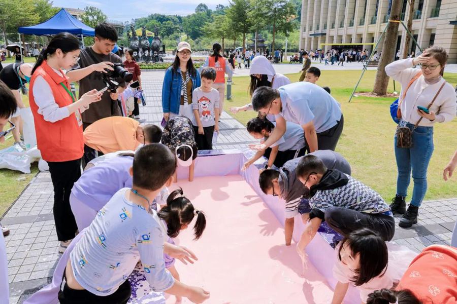 中心广场的互动区里,一个装有淡粉色浓稠液体的容器吸引了众多市民驻足,大家里三层外三层围得水泄不通。“这是什么?摸起来好软!不对,怎么又变硬了?”在志愿者的指引下,成年人与小朋友纷纷伸手一探究竟。“这是‘非牛顿流体’,它的特性是‘你越用力触碰,它就越坚硬’。” 志愿者耐心向体验者解释这一物质的科学原理。