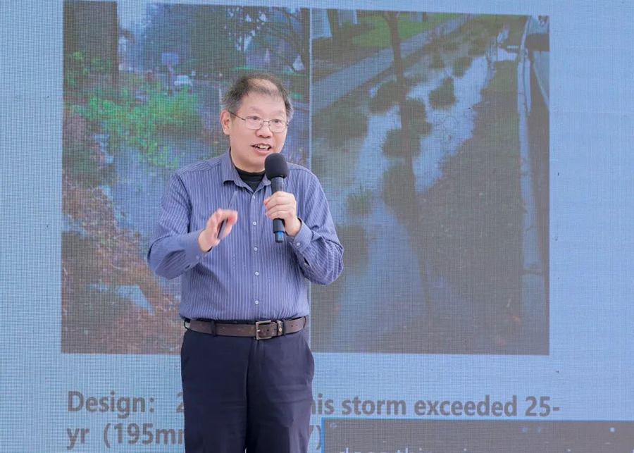 珠海深圳清华大学研究院创新中心智慧海绵研究所所长、中山大学土木工程学院特聘教授佘年以《海绵城市韧性治理:通过低影响发展缓解极端天气事件》为题展开分享。他系统阐释海绵城市建设的核心目标,并分享了诸多成功案例与实践经验。佘年强调,海绵城市的核心在于破解城市内涝难题、改善水环境质量,关键在于秉持“基于自然的解决方案”理念——通过雨水花园、植草沟等分散式绿色雨水基础设施,有效恢复城市开发前的自然水文循环状态,让城市如同天然森林般具备强大的雨水吸纳与渗透能力。