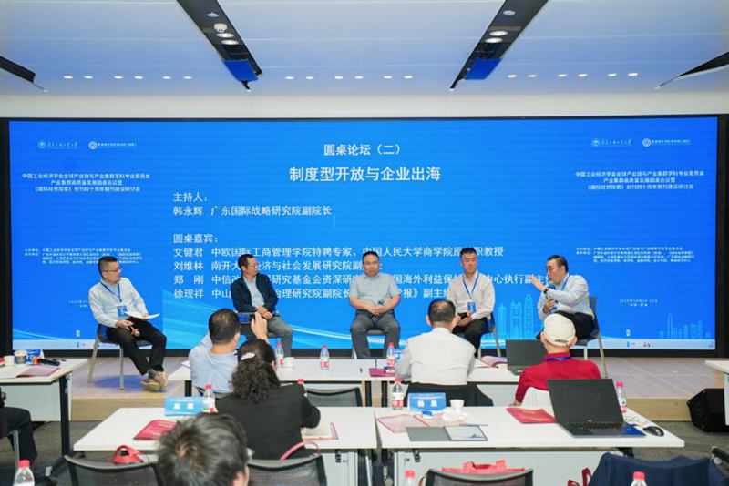 第二场圆桌论坛聚焦“制度型开放与企业出海”,由广东国际战略研究院副院长韩永辉教授主持。中欧国际工商学院特聘专家文健君结合实战经验,系统梳理了企业从“产品出海”“产能出海”到“供应链出海”与“核心能力出海”的演进逻辑。南开大学经济与社会发展研究院副院长刘维林教授提出企业出海需实现从“技术应用”到“技术标准定义”、从“供应链管理”到“全球产业生态协同”、从“国内合规”到“全球合规与价值观沟通”的三重能力转变。中信改革发展研究基金会资深研究员郑刚指出,企业出海已进入风险常态化的新阶段,必须建立集地缘政治、产业规则、贸易安全于一体的风险监测预警体系。中山大学国家治理研究院副院长徐现祥教授则提出政府应通过“共识效应”“资源生成”和“锚定效应”,为企业出海超前引领、松绑赋能,呼吁建立与高质量发展相匹配的多维指标体系。