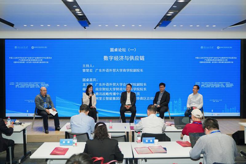本次研讨会安排了两个圆桌论坛。首场圆桌论坛以数字经济与供应链为主题,由广东外语外贸大学商学院副院长曾楚宏教授主持。广东外语外贸大学会计学院副院长龙文滨教授阐述了数字经济如何通过数据透明化、流程优化赋能供应链碳减排,为企业应对绿色贸易壁垒提供了微观视角。南京财经大学财政与税务学院院长杨继军教授基于对中美供应链断链的研究,指出通过数字技术加强供应链安全相较于“空间重组”更具经济合理性。腾讯战略传播中心高级研究员陈创前分享了“智能经济”作为技术扩散过程的前沿观察,强调场景与应用是驱动AI技术落地的关键。阿里云智能集团战略发展部华南区总经理谢天则分析了中美在AI供应链领域的博弈态势,指出全栈自主可控能力的重要性,并分享了AI技术为国际贸易带来的新动能、新工具和新服务模式。、