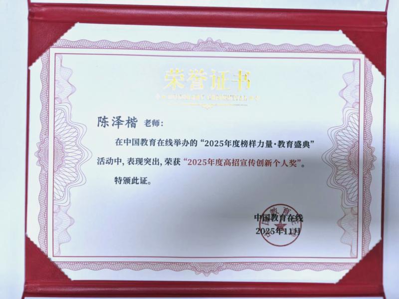 这一殊荣不仅是对陈泽楷老师个人在高招宣传工作中的高度认可,更是彰显了学校在招生宣传创新方面的坚定决心与显著成效。其成功经验将激励更多的教育工作者勇于创新、敢于实践,为学校的招生工作注入新的活力与动力。