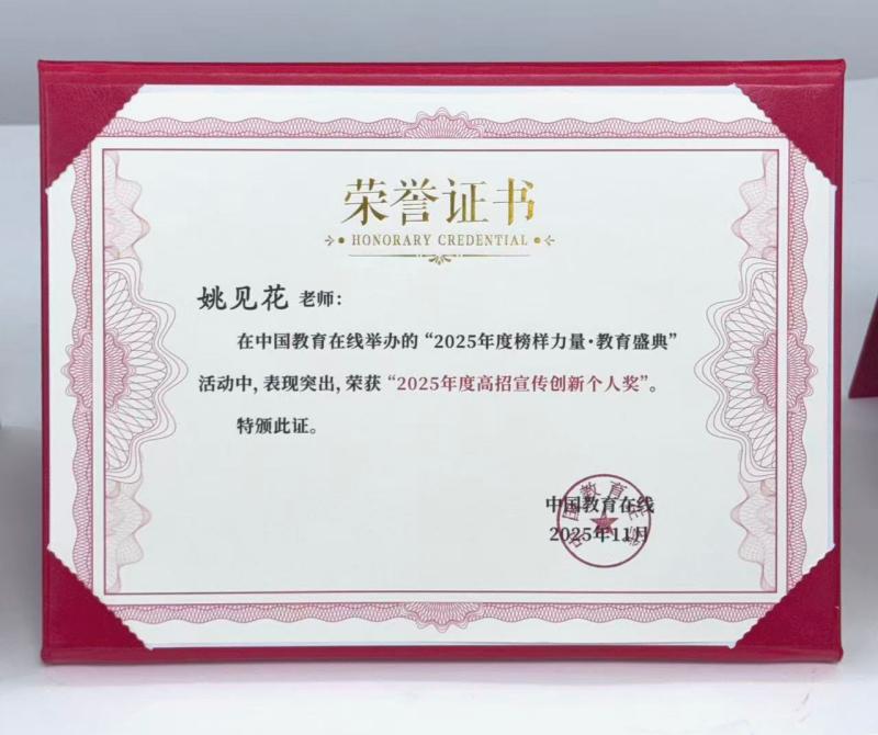 近日,中国教育在线“榜样力量·2025年度教育盛典”优秀案例名单公布。广州华商学院姚见花老师凭借在招录工作中的创新能力和独到见解,获评“2025年度高招宣传创新个人”称号。