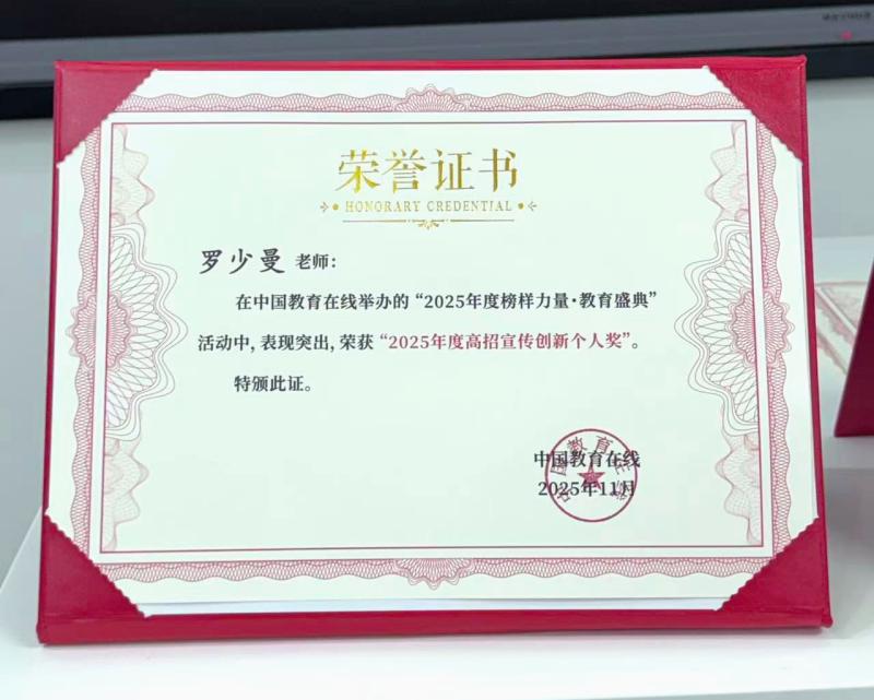 近日,中国教育在线“榜样力量·2025年度教育盛典”优秀案例名单公布。广东松山职业技术学院罗少曼老师凭借在招录工作中的创新能力和独到见解,获评“2025年度高招宣传创新个人”称号。