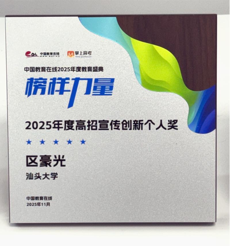 近日,中国教育在线“榜样力量·2025年度教育盛典”优秀案例名单公布。汕头大学区豪光老师凭借在招录工作中的创新能力和独到见解,获评“2025年度高招宣传创新个人”称号。
