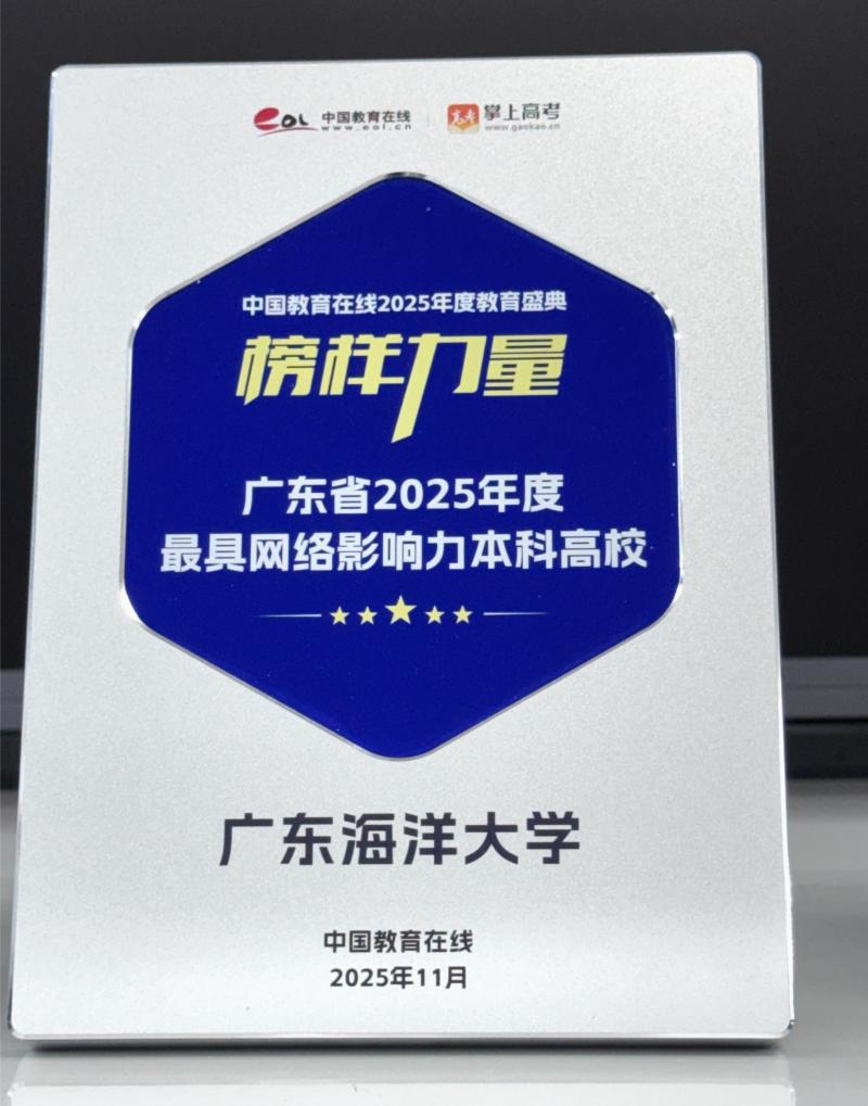 近日,中国教育在线“榜样力量·2025年度教育盛典”优秀案例名单公布。广东海洋大学凭借极具创新性与前瞻性的招生宣传策略,以及扎实过硬的宣传执行实力,从众多高校中突围,获评“广东省2025年度最具网络影响力本科高校”。