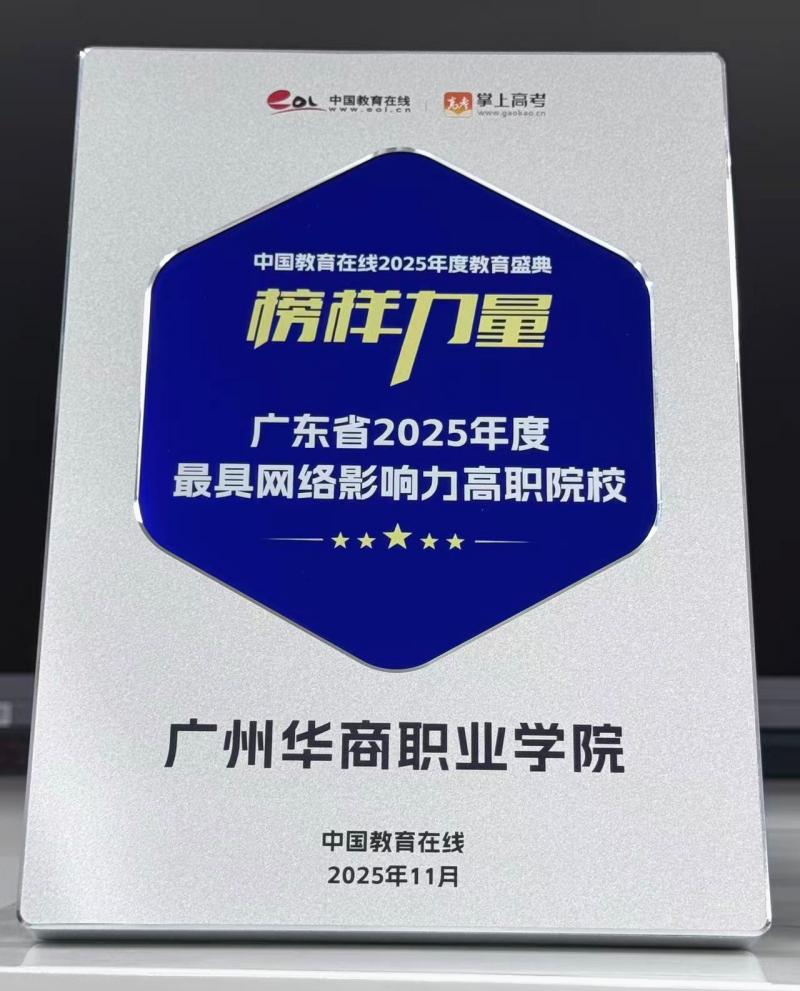 近日,中国教育在线“榜样力量·2025年度教育盛典”优秀案例名单公布。广州华商职业学院凭借极具创新性与前瞻性的招生宣传策略,以及扎实过硬的宣传执行实力,从众多高校中突围,获评“广东省2025年度最具网络影响力高职院校”。