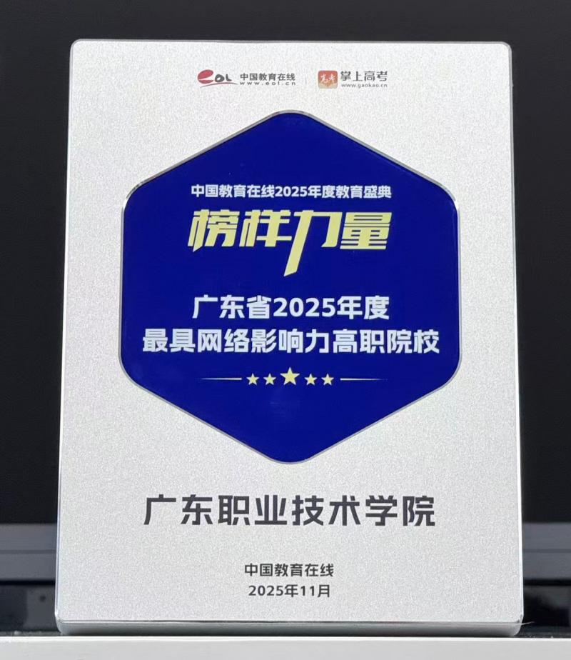 近日,中国教育在线“榜样力量·2025年度教育盛典”优秀案例名单公布。广东职业技术学院凭借极具创新性与前瞻性的招生宣传策略,以及扎实过硬的宣传执行实力,从众多高校中突围,获评“广东省2025年度最具网络影响力高职院校”。