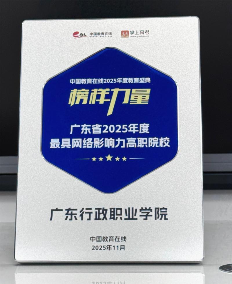 近日,中国教育在线“榜样力量·2025年度教育盛典”优秀案例名单公布。广东行政职业学院凭借极具创新性与前瞻性的招生宣传策略,以及扎实过硬的宣传执行实力,从众多高校中突围,获评“广东省2025年度最具网络影响力高职院校”。
