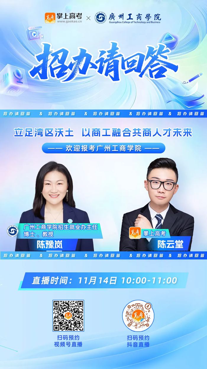 本周五上午10点,锁定《招办请回答》直播间,与广州工商学院相约!一起在湾区的机遇里,找到属于你的成长赛道!