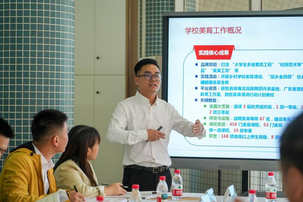 30日上午,调研组在广东白云学院北校区召开调研会。校长刘剑锋、党委书记孙国忠、副校长纪秋颖与会致辞。数智融媒美育名师工作室主持人成骏教授从“数智融媒特色定位—多学科团队建设—制度与经费保障—课程与活动成果—社会服务与传播”五个方面作专题汇报。自2024年12月立项以来,工作室已将美育全面嵌入人才培养体系,建成融媒体实验中心与跨院系实践平台,打造“金云奖”大学生影像节等品牌活动,形成“课程+作品+传播”的闭环;同时两度深入粤北中小学开展调研,发布报告并对接美育浸润项目。专家组认为,白云学院以“数智+融媒”赋能美育的路径清晰、节奏有力,建议进一步完善“课堂—社团—赛事—媒体”四位一体的成果转化链路,打造可视化数据仪表盘与开放课程资源库,放大示范辐射。