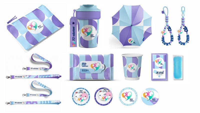 当“小海豚”们以专业服务保障赛事运行时,天河区城市志愿者的“激励物资包”则是广工设计深入城市肌理、传递人文关怀的“温情注脚”。物资包由学校艺术与设计学院副教授于倩倩带领宋南希、谷雨涵等同学设计制作,视觉上将蓝色矩形与紫色半圆碰撞融合,其中蓝色矩形源自城市轮廓,象征天河区的科技感与秩序;紫色半圆则取材岭南花窗与珠江潮汐,体现激情与包容,整体构建出“理性与诗意共生”的美学表达。