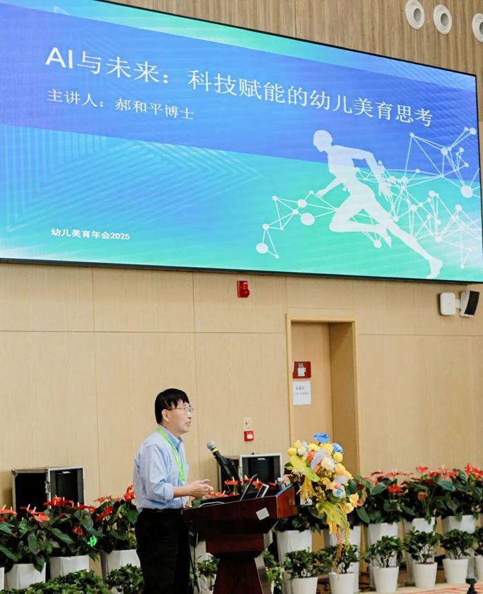 陈湘波从科学与艺术融合的视角出发,结合深北莫附属幼儿园生动实践,“环境即教育,生活即教育”的理念让美育融入每个角落。同时他也指出“AI不仅是工具,更是创意新伙伴”,AI技术激发了孩子从“被动接受”走向“主动创造”,实现科技与美育的有机共生。