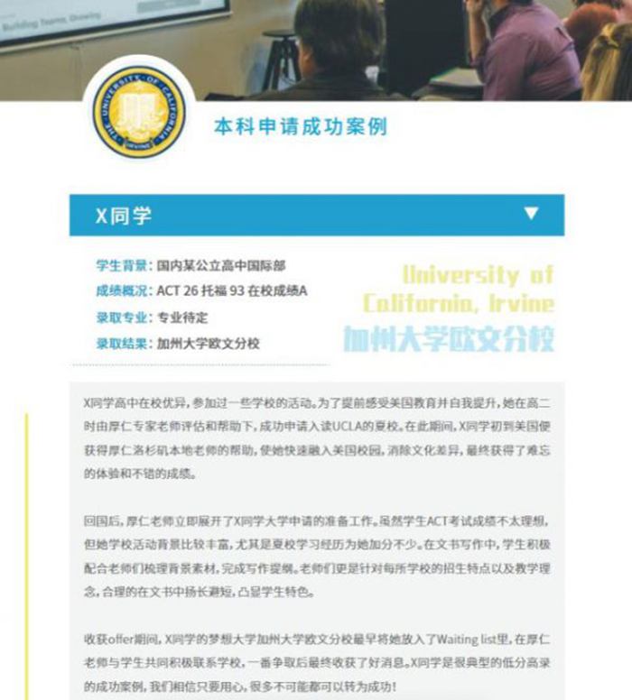 ●资深团队:美国本科申请中介-厚仁教育由藤校前院长带队,98%团队成员拥有海外留学背景。多对一服务模式,组成学生申请的坚实后盾,结合名校思维模式,精准指导,助力学生斩获理想院校录取。