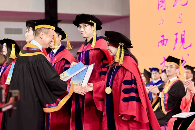 典礼由副校长罗智泉教授宣读博士毕业生名单,各学院院长宣读硕士学科名单。研究生院院长王学锋教授宣读“校长杰出研究生奖”获奖名单,校长徐扬生教授为杰出毕业生代表颁授“校长杰出研究生奖”,一本记载着荣誉的证书与一枚闪耀的奖牌,承载荣誉更寄托期许——愿你们奔赴更广阔天地,为人类社会进步贡献不竭力量。10名“校长杰出研究生奖”获得者分别是:材料科学与工程哲学博士陆喆(逸夫书院、理工学院)、计算机与信息工程哲学博士许牧天(思廷书院、理工学院)、计算机与信息工程哲学博士马献平(思廷书院、理工学院)、金融学哲学博士王昱衡(逸夫书院、经管学院)、全球研究哲学博士何丹娜(学勤书院、人文社科学院)、作曲与作曲技术理论文学硕士陈曦(第八书院、音乐学院)、应用心理学理学硕士汪思渝(逸夫书院、人文社科学院)、管理学理学硕士黄泽灿(厚含书院、经管学院)、同声传译文学硕士季伊忱(祥波书院、人文社科学院)、计算机与信息工程哲学硕士万瀚文(永平书院、理工学院)。