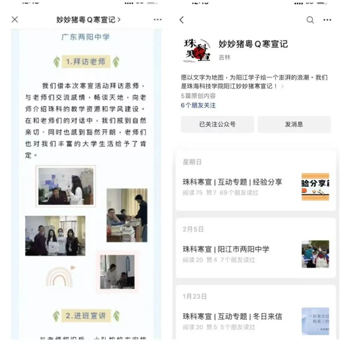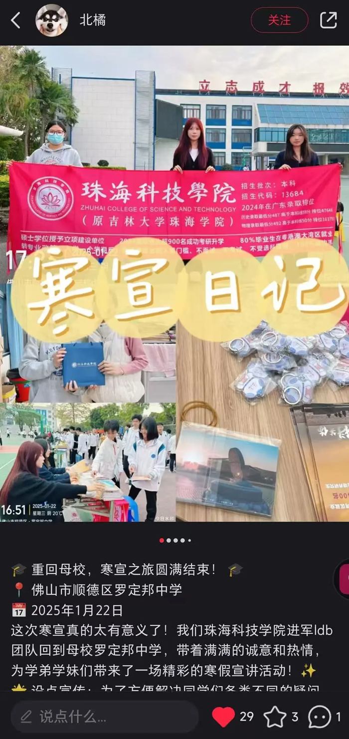 成功报名的队伍可在寒假期间重返母校中学,借助举办报告会、交流会、宣讲会等多样活动,和学校领导、老师以及学弟学妹们面对面交流,分享高考备考的心得与考试经验。与此同时,讲述自己在大学的学习生活,介绍珠海科技学院的基本情况、招生政策,展示珠科的校园风采,搭建起中学与我校之间的沟通桥梁。