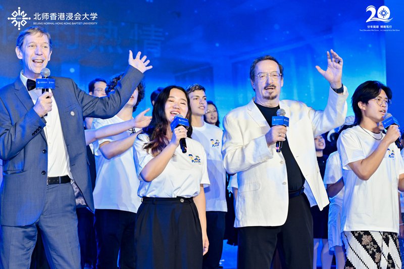 校庆日当天,北师港浸大推出《北师香港浸会大学校史(2005—2025)》《恰同学少年:建校20周年校友访谈》《弦歌廿载:我与北师港浸大的故事》系列新书,以文字铭刻二十年办学征程。当晚,中外师生校友联袂献上精彩演出,全球校友送祝福,广州“小蛮腰”、珠海“日月贝”等城市地标同步亮灯致贺,将校庆喜悦氛围推向高潮。