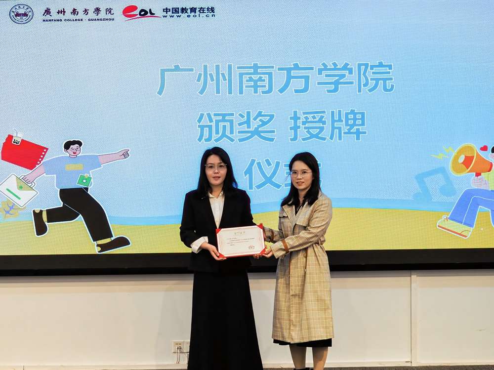 中国教育在线总编助理何静萍(右)为广州南方学院颁发“新媒体影响力”荣誉证书。(广州南方学院党委宣传部副部长胡君(左))