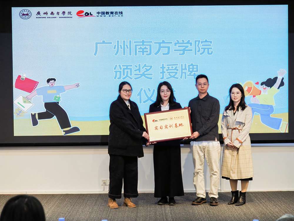 中国教育在线广东站副主编陈承志(右二)为广州南方学院“实习实训基地”授牌。(广州南方学院党委宣传部副部长胡君左二、教务处处长助理蓝婵婷左一,中国教育在线总编助理何静萍(右一)