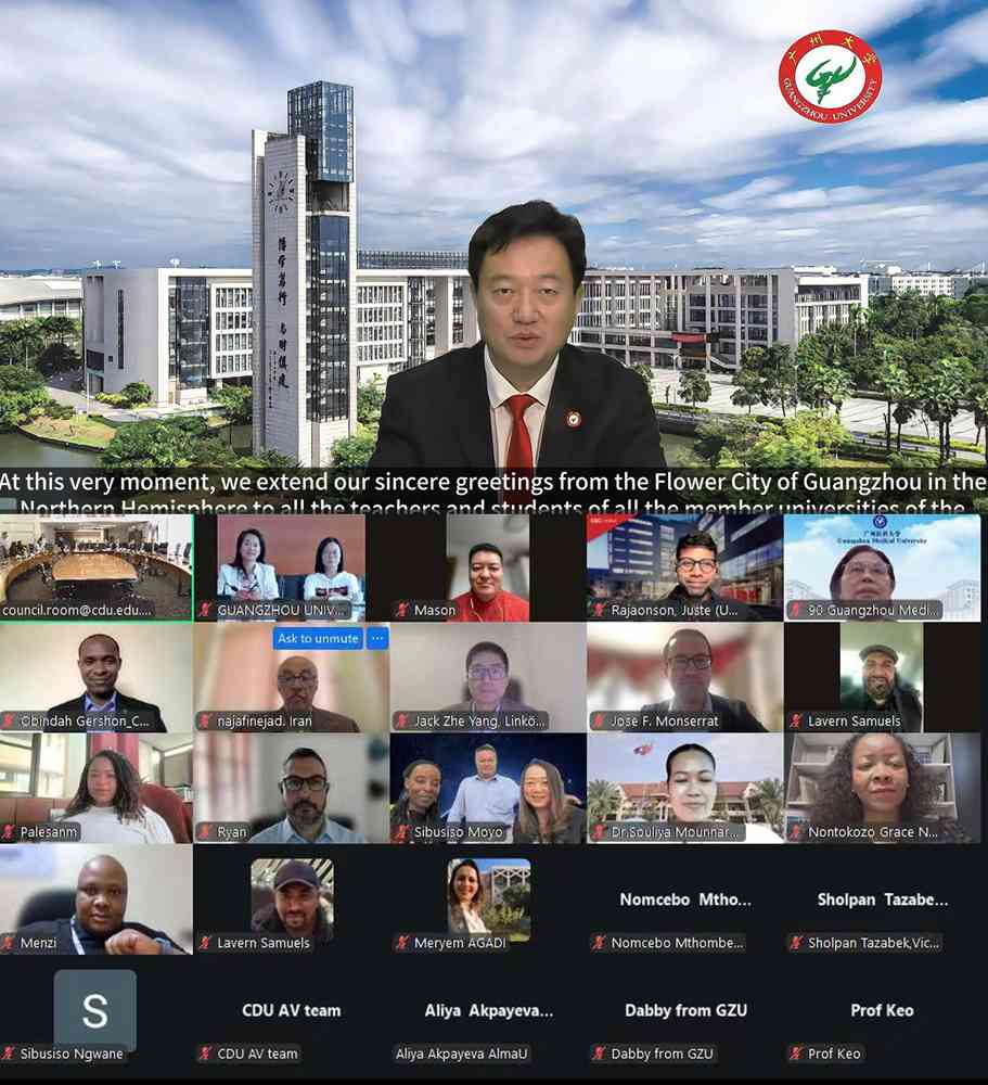 广州大学党委书记、联盟主席欧阳谦博士通过视频方式致辞并作联盟工作报告。欧阳谦指出,经过七年的发展,联盟已成为联结广州110个世界友好城市的重要抓手和交流平台,“朋友圈”不断扩大。志合行远,联盟发展所取得的成绩都离不开各成员大学的参与和支持,希望联盟成员大学坚守互学互鉴互惠、共创共享共赢的初心,秉持将联盟打造成为友城大学携手促进城市可持续发展国际范例的使命,以城为媒、依城而兴,朝着构建友城大学命运共同体的目标,加速联盟合作发展新进程,共创属于联盟各成员大学更加美好的未来。