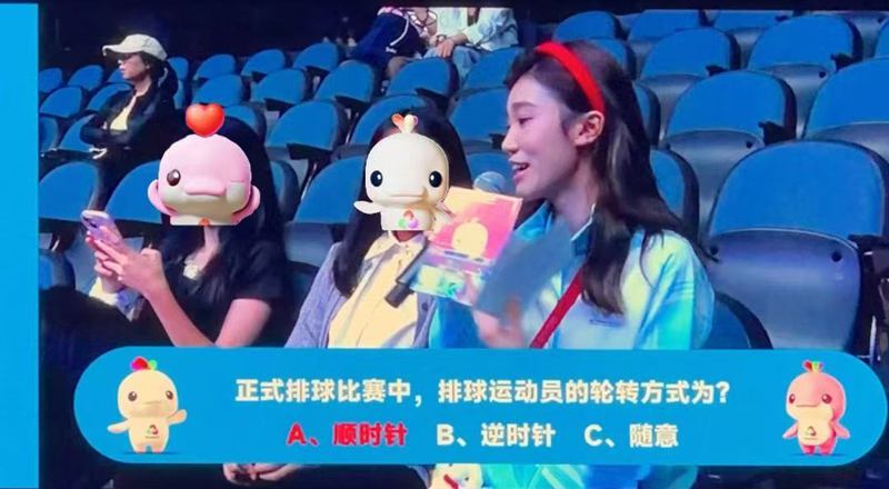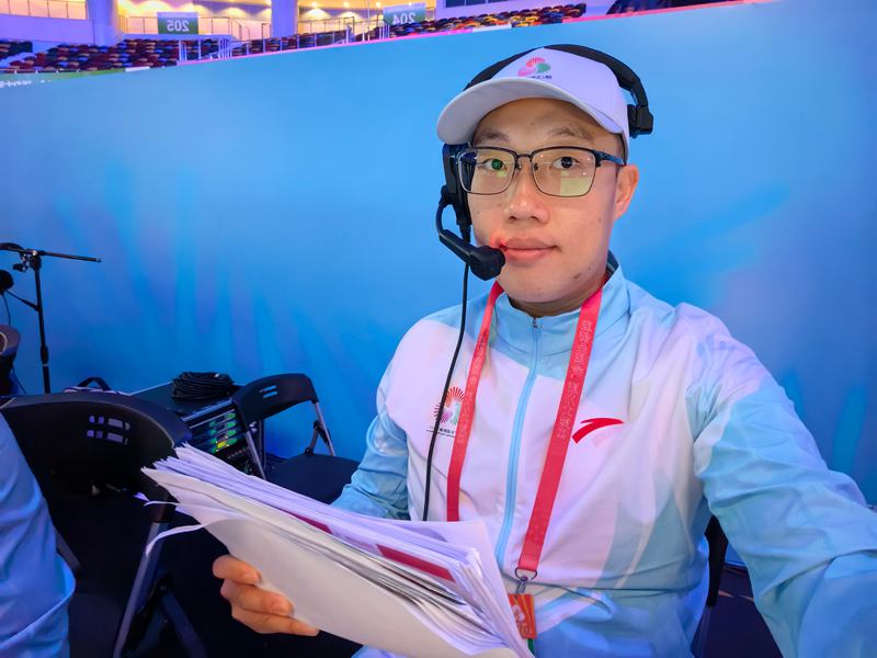 赛场导演、播报的岗位上,也有广大人的身影。在澳门东亚运动会体育馆的女排赛场,体育展示导演宋泽诚是广州大学播音与主持艺术专业校友。他既要统筹DJ、MC等多个岗位的节奏衔接,又要依据流程单精准把控环节节点,以细致的协调与灵活的调整,让赛场氛围与赛事进程高效适配,尽显广大学子的责任与专业。来自广州大学25级戏剧与影视艺术专业的硕士生李梓皓,在本次全运会主要负责赛前仪式播报、赛中运动员得分播报、场间的MC观众互动环节,以及颁奖仪式播报,准确播报赛事内容以及赛会介绍,热情与观众进行游戏互动,带动赛场氛围,同时负责赛前仪式工作梳理以及颁奖仪式流程引导。他们用青春力量在全运一线温暖托举,为精彩赛事添砖加瓦。新闻与传播学院2023级本科生何烨彤也在女排赛场担任现场主持人。