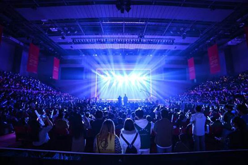 节目开始后,观众席上,荧光棒随旋律流转成流动的星河,黄紫交织的光影与跃动的节奏交织出梦幻画卷。前排师生手持应援棒组成光浪,后排观众自发亮起手机闪光灯点缀星点,此起彼伏的喝彩声如春风拂过场馆,将热烈氛围晕染至每个角落。当节目进入高潮,雷鸣般的掌声自四面八方涌向舞台,为每个惊艳瞬间加冕、为每位演绎者喝彩,声浪层层叠叠撞向穹顶,将广州新华学院二十年校庆的喜悦推向沸腾的顶点。