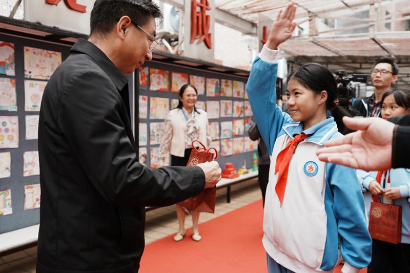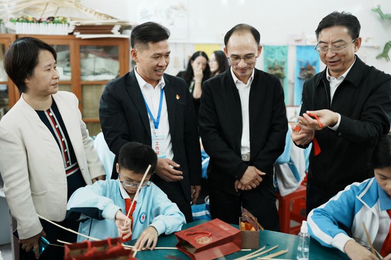 随后,大家前往广宁县第六小学,现场观摩小学生竹编课程,并参观了小学生竹编作品展示。