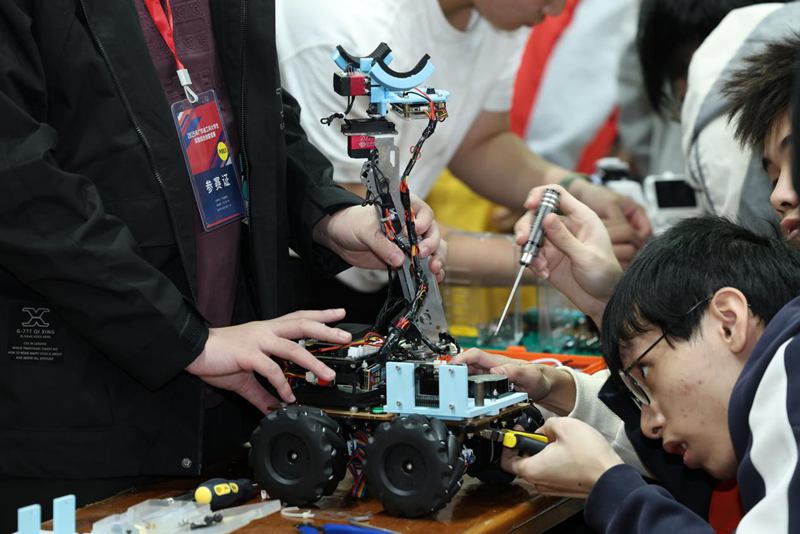 反恐排爆救援机器人赛区气氛紧张有序。参赛队伍自主设计具备排爆、反恐、救援的机器人,穿越模拟障碍,利用视觉系统精准识别、机械臂精准抓取“爆炸物”并放入排爆桶,同时确定“恐怖分子”位置将其击倒,最后找到救援目标将其带至安全区域。比赛吸引了全场人员的目光,大家屏息凝神关注机器人的动作动向,每一次完美的排爆救援都引得现场爆发出雷鸣般的掌声。