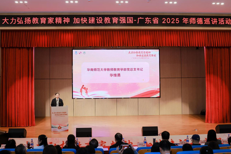 活动伊始,华南师范大学教师教育学部党总支书记华维勇发表了致辞。他指出,本次以“大力弘扬教育家精神,加快建设教育强国”为主题的巡讲,是响应党中央号召、落实省委部署的具体举措。他引用习近平总书记2024年全国教育大会讲话精神,强调教育强国对民族复兴的重要意义,重申教师为党育人、为国育才的使命。期待通过优秀教师分享与理念传递,让线下参会者汲取智慧、线上直播辐射更广,推动粤港澳大湾区师德师风建设走深走实。