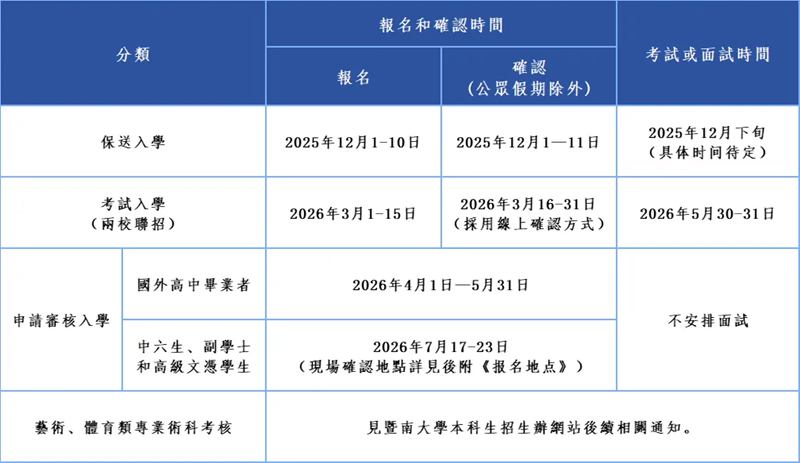 註:上述日期及事項或有更新,將在暨南大學招生辦公室官網公佈。