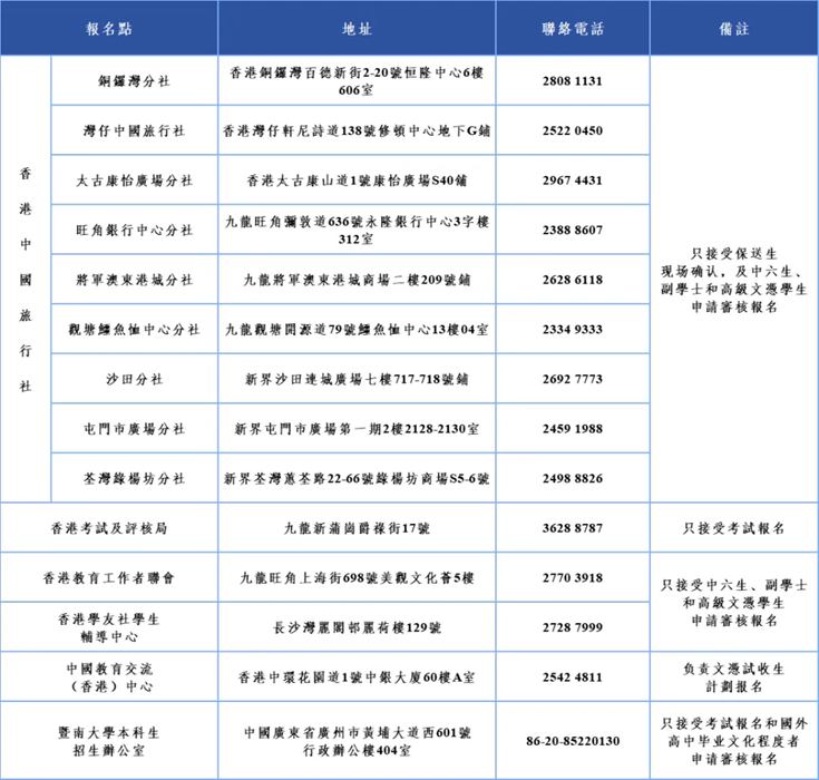 考生需登入報名網填寫報名信息,經提交成功後,生成《暨南大學、華僑大學招收港澳台僑學生和華人及其他外籍學生報名表》(註意:表格不設下載鏈接),再列印報名表,核對無誤後,簽名確認,並附上所需報名材料到各報名點辦理現場確認(兩校聯招考試僅需線上確認,無須現場確認),同時繳付報名費。