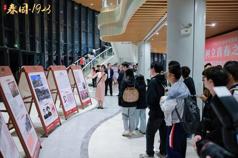演出前,广工文化活动中心演艺厅外人头攒动,在讲解员的引导下,朱蔚蔚与师生们共同观看了 “凝聚共识开创伟业——中国共产党第三次全国代表大会” 主题图片展。展览通过16块展板、32面珍贵历史图片和文献资料,生动展现了中共三大的辉煌历程和代表们的革命事迹,为青年学子搭建起一座连接历史与现实的桥梁。同学们驻足凝望,细心聆听,在图文并茂的史料中追寻先辈足迹,感悟伟大建党精神。