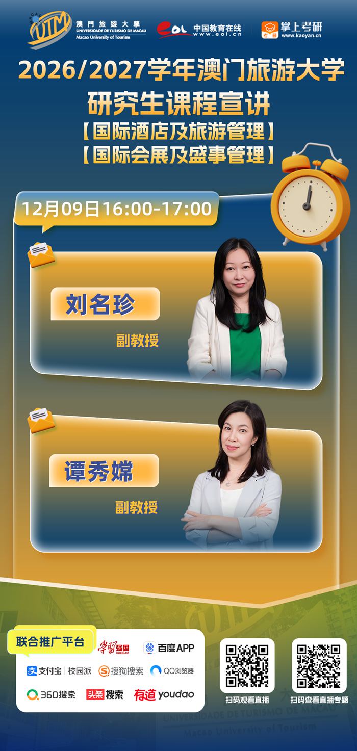 直播预告 | 12月09日,2025年澳门旅游大学研究生课程招生宣讲会与你不见不散!