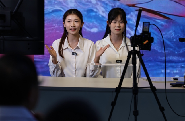 在工坊成果展示区,校领导详细查看了师生在数字商贸领域的科研成果与竞赛获奖证书,对其在产学研融合与学生创新能力培养方面取得的成效表示认可。随后,领导一行走进助农直播实践直播间与经管直播间,现场观摩学生团队在直播运营、主播演示等环节的实际操作,沉浸式体验了数字商贸实战教学场景。
