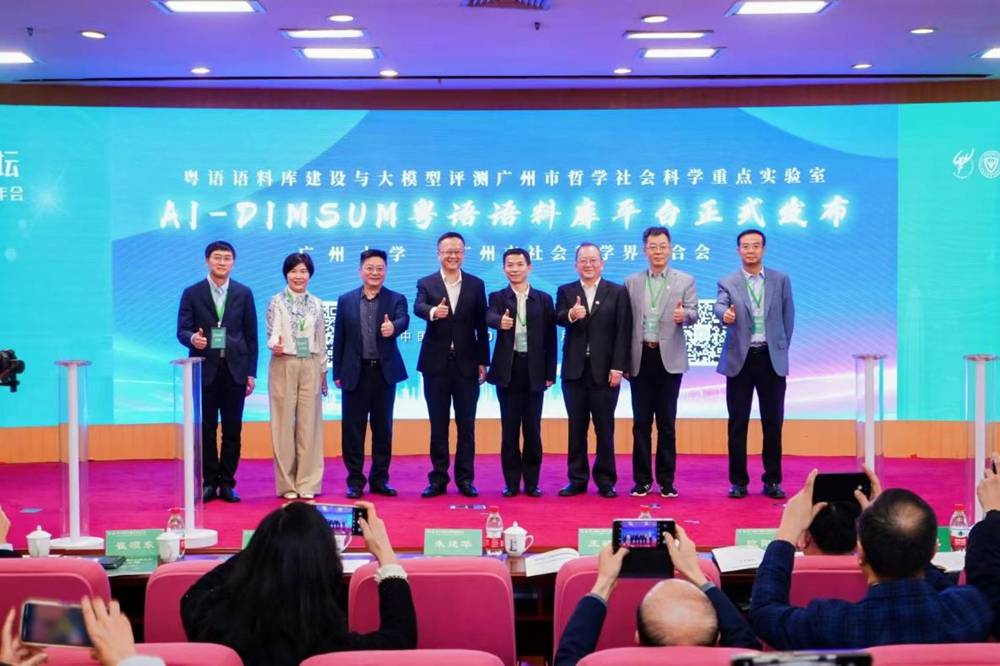 成果发布环节商务印书馆余桂林副主编主持,实验室主任齐佳音介绍了AI-DimSum粤语语料库平台。之后,由朱建华、王敏伟、屈哨兵、崔颂东、张其学、齐佳音、张延平(广州大学社科处处长)、禤健聪(广州大学人文学院院长、实验室副主任)等共同启动AI-DimSum粤语语料库平台上线,标志着粤语语料库建设与大模型评测广州市哲学社会科学重点实验室第一年建设取得重要进展和标志性成果。