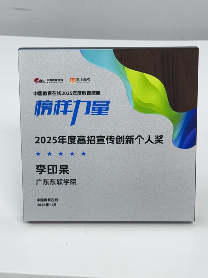 近日,中国教育在线“榜样力量·2025年度教育盛典”优秀案例名单公布。广东东软学院李印杲老师凭借在招录工作中的创新能力和独到见解,获评“2025年度高招宣传创新个人”称号。