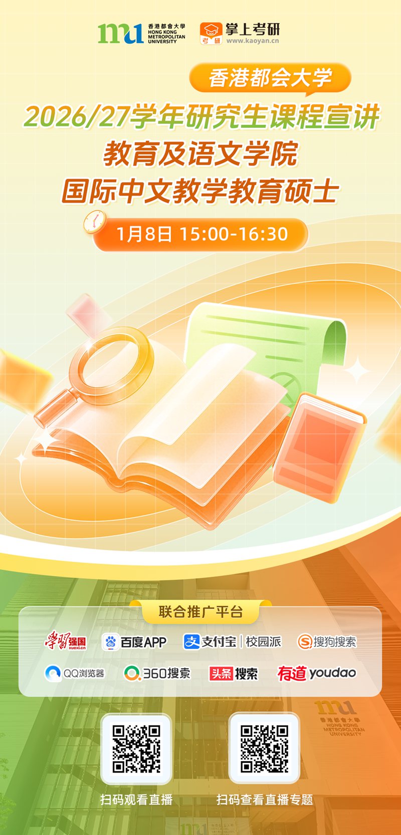 直播预告|1月8日,香港都会大学2026/27学年研究生课程宣讲——教育及语文学院