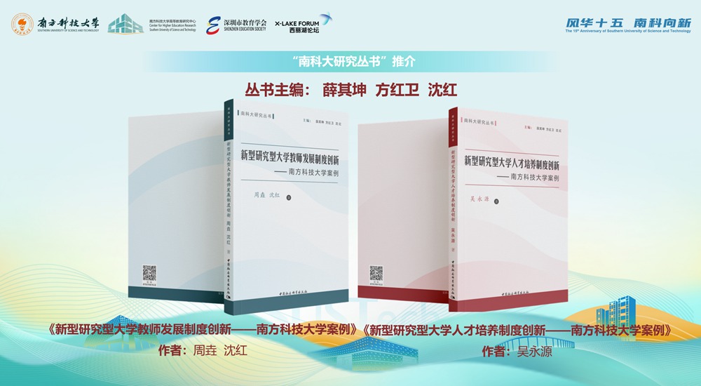 在研究成果发布环节,沈红讲席教授发布了由中国社会科学出版社出版,南方科技大学校长薛其坤和方红卫、沈红主编的“南科大研究丛书”中的前两部专著:《新型研究型大学教师发展制度创新——南科大案例》与《新型研究型大学人才培养制度创新——南科大案例》,展示了南科大人将新型研究型大学理论与实践相结合的最新研究成果。
