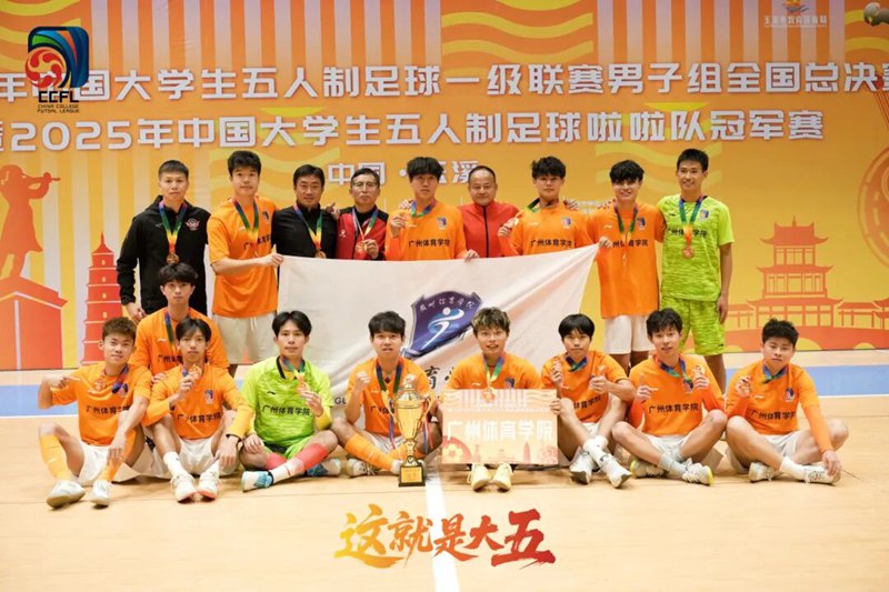 12月29日下午,2025年中国大学生五人制足球一级联赛男子组全国总决赛圆满落幕!广州体育学院五人制足球队在全国12支顶尖高校队伍的激烈角逐中一路披荆斩棘,最终在总决赛以3:2力克蝉联十一届冠军的湖北大学,以六战全胜的辉煌战绩,强势问鼎!这不仅是一次巅峰对决的胜利,更是一场创造校史新纪录的壮举!