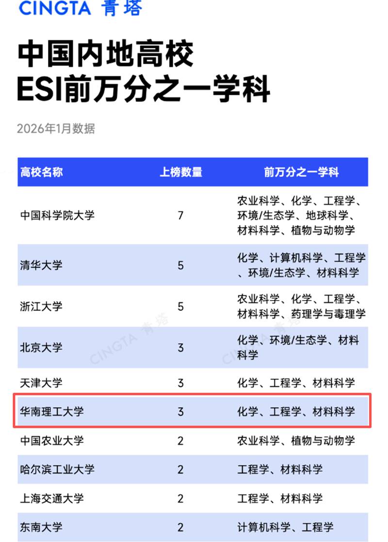 据介绍,华南理工大学“材料科学”学科的校内主要贡献单位为材料科学与工程学院、化学与化工学院、机械与汽车工程学院、前沿软物质学院等。材料学科本次进入ESI全球前万分之一,是华南理工大学推进一流大学和优势学科建设、加速挺进全球百强大学进程中的又一次重大突破。