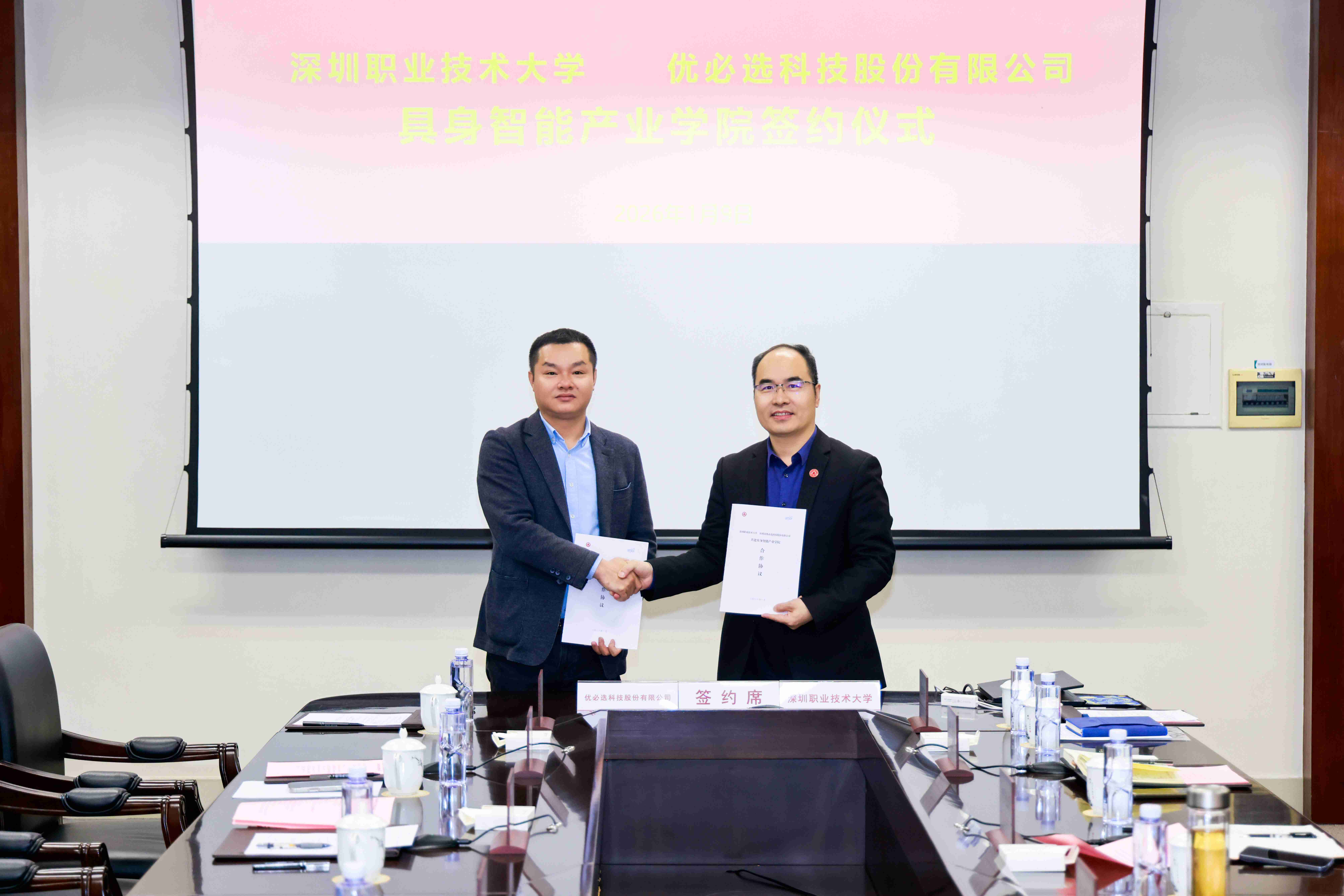 全国职业本科院校首家“具身智能产业学院”落地深圳职业技术大学(以下简称“深职大”)。1月9日,深职大与深圳市优必选科技股份有限公司(以下简称“优必选”)共建具身智能产业学院签约暨揭牌仪式在深职大西丽校区举行。深职大党委副书记、校长许建领,优必选科技高级副总裁、教育与消费者事业群总裁钟永等领导嘉宾出席活动。仪式由人工智能学院副院长(主持工作)池瑞楠主持。