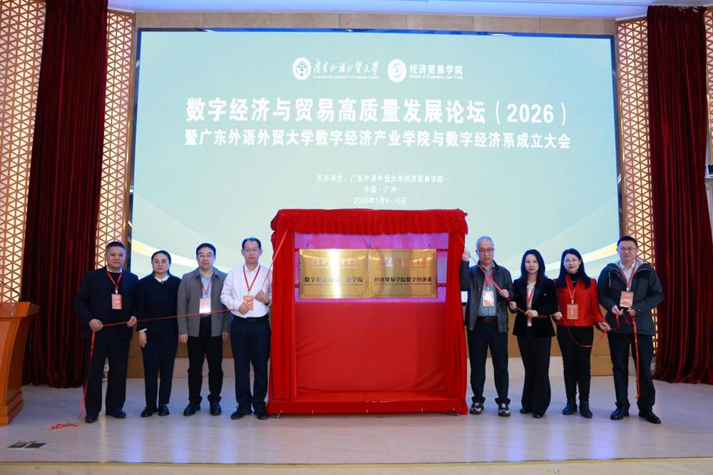 广东外语外贸大学党委常委、副校长申明浩教授在开幕式致辞中代表学校对论坛召开及数字经济现代产业学院、数字经济系成立表示热烈祝贺,并向与会专家学者和业界嘉宾致以诚挚欢迎。他指出,数字经济已成为重塑全球经济结构和国际竞争格局的关键力量,广东外语外贸大学始终坚持与国家战略同频共振,依托鲜明的国际化办学特色和经贸学科优势,持续深化有组织科研与高层次人才培养。此次成立数字经济现代产业学院与数字经济系,是学校主动服务数字中国建设、粤港澳大湾区发展和高水平对外开放的重要举措,标志着学校在数字经济领域的教学科研和社会服务迈入体系化、实体化发展的新阶段。学校将以此为契机,着力构建产学研用深度融合的人才培养和创新体系,为数字经济高质量发展提供坚实支撑。申明浩副校长宣布广东外语外贸大学数字经济现代产业学院与数字经济系成立,并与经贸学院主要领导、兄弟高校和企业界的代表一起进行了揭牌仪式。