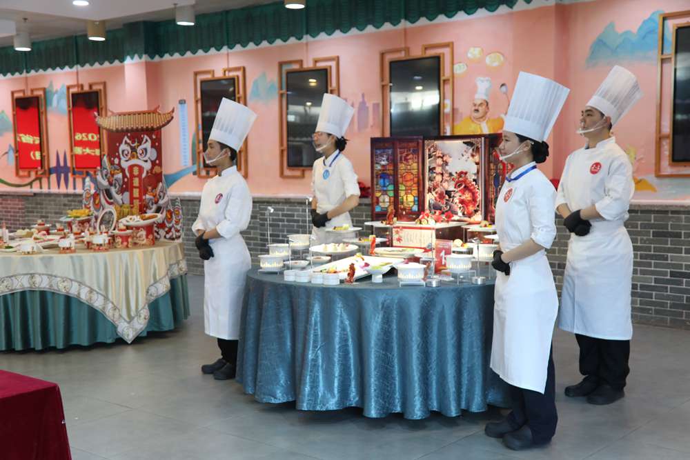 上午8时,随着一声令下,第一组参赛队迅速进入状态。热菜区选手们刀工精湛,菜刀上下翻飞, 炉火熊熊,参赛选手抛锅动作行云流水,为精准呈现自选菜肴而分秒必争;面点区擀杖轻舞,面团在指尖幻化出精巧造型,蒸烤之间尽显功力;冷拼区刀光闪烁,食材被雕琢成栩栩如生的拼盘构件,一主盘四围碟的食材涵盖三荤三素,方寸之间见天地。赛场内,既有指定品种的严谨规范,又有自选作品的创意绽放,每一道工序都在与时间赛跑,每一个细节都凝聚着日常训练的汗水。