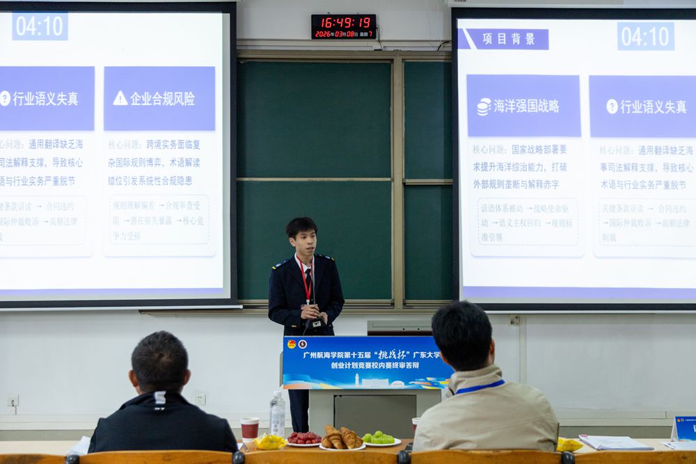 3月8日,广州航海学院第十五届“挑战杯”广东大学生创业计划竞赛校内决赛圆满落幕。30支入围团队齐聚B11教学楼,以一场充满“海味”与“蓝劲”的路演答辩,拉开了新学期序幕,展示了学校在海洋强国、智慧交通等领域的最新学生双创成果。
