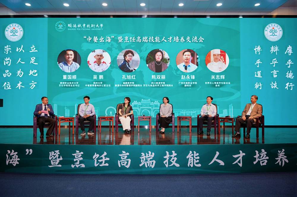 在圆桌交流环节,世界华人粤菜烹饪联合会会长关志辉、广州华商职业学院副校长赵永锋、四川旅游学院烹饪与食品科学工程学院院长熊双丽、福建商学院旅游与休闲管理学院副院长孔旭红、扬州大学中餐繁荣基地办公室主任吴鹏、顺德职业技术大学烹饪学院党总支书记董国顺围绕“‘中餐出海’现状与展望”主题进行了交流对话,分享实践经验与工作成效。