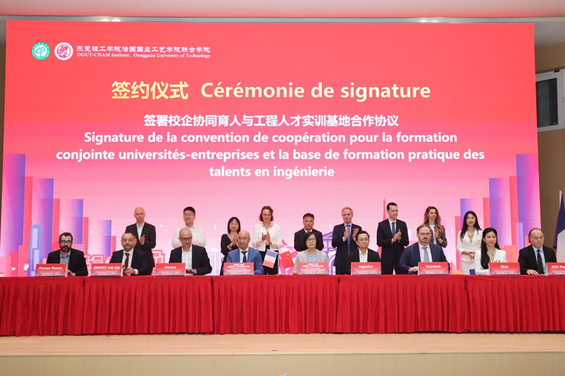 3月30日上午,东莞理工学院中法工程人才培养国际合作与校企协同发展大会在学校国际合作创新区举行。现场,东莞理工学院与法国国立工艺学院签署了东莞理工学院法国国立工艺学院联合学院(以下简称为“中法学院”)本硕贯通联合培养协议,中法学院与7家行业领军企业签署校企协同育人与工程人才实训基地合作协议。